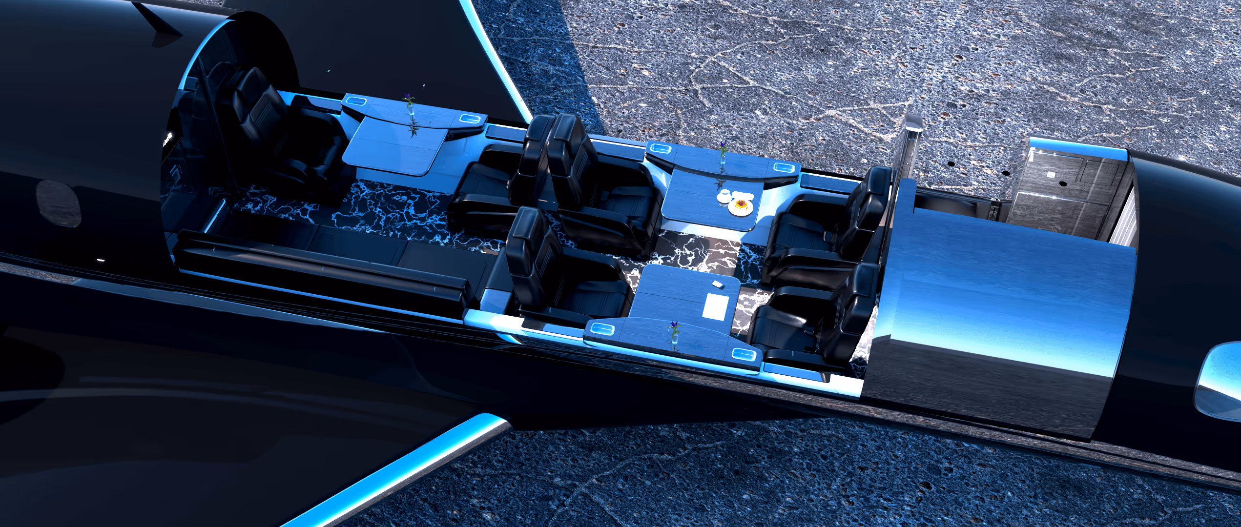 Club seating for four,Conference group seating,Divan,Stone flooring,Wet galley,HD monitors,Wi-Fi,Enclosed lavatory